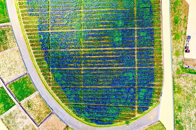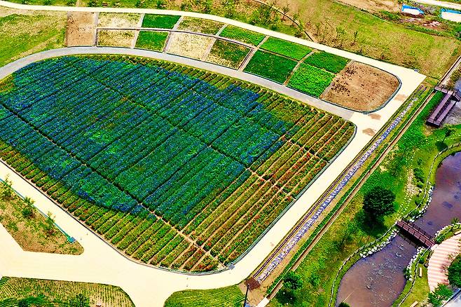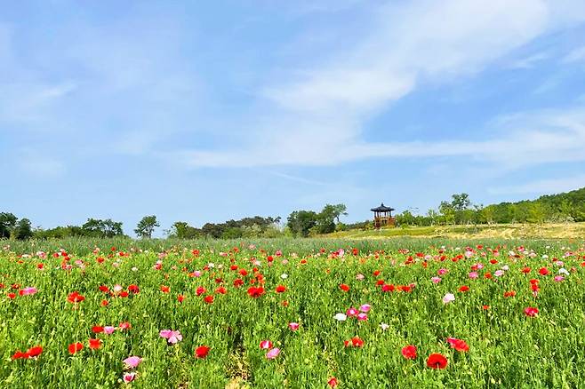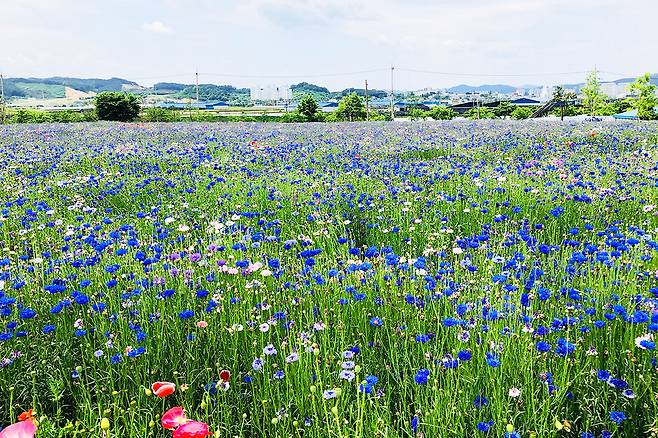 약 5,000㎡ 규모의 이 꽃밭에는 증평군농업기술센터가 지난해 가을부터 직접 파종한 꽃양귀비와 수레국화가 이달 중순부터 절정을 이루며 피어났다.