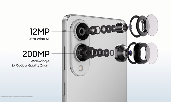 그러나 광각 카메라에 갤럭시 S25·S25+에 들어간 5,000만 화소가 아닌 갤럭시 S25 울트라급에 해당하는 2억 화소 이미지 센서와 2배 광학 품질 줌 기능을 탑재했다. 이는 초고해상도 사진 촬영 뿐만 아니라 주변 픽셀을 결합하여 저조도 야간 촬영 시 더 많은 빛을 받아들여 더욱 선명한 결과물을 얻을 수 있다. 1,200만 화소 초광각 카메라는 넓은 프레임을 한 번에 촬영할 수 있고, 접사 촬영을 위한 자동초점(Auto Focus, AF)도 추가되었다.