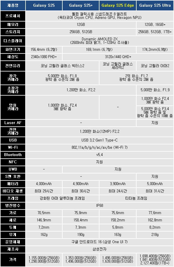 메모리 및 스토리지 구성은 갤럭시 S25·S25+와 똑같이 12GB RAM에 내부 스토리지 256GB 및 512GB 옵션으로 출시된다. 16GB 메모리와 1TB 스토리지 옵션은 여전히 갤럭시 S25 울트라의 전유물인 셈이다.