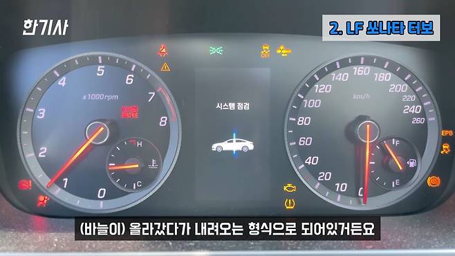 그리고 계기판이 좀 많이 다르거든요. 원래 LF 쏘나타 같은 경우에는 바늘이 누워 있다가 올라오는 형식인데 얘는 바늘이 처음에 6시에 가 있어서 올라왔다가 퍼포먼스로 내려오는 형식으로 돼있거든요. 아우디를 보고 따라한 게 아닌가 싶어요.