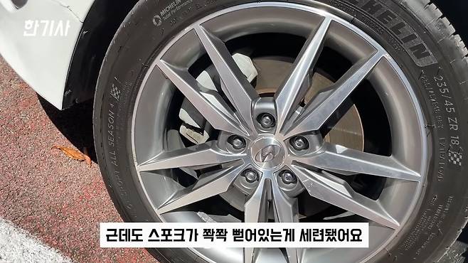 옆쪽 라인 봤을 때 사이드스커트 부분에 무광으로 다 마감을 해놓은 크롬이 있고요. 휠이 진짜 마음에 들어요. 사실 18인치 휠인데도 스포크가 쫙쫙 뻗어 있는 게 세련됐어요. 현대가 '우리도 이걸 만들 수 있다'고 각 잡고 만든 모델이 아닌가 싶어요.