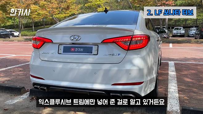 그리고 후면부에도 테일 램프가 LED로 되어 있거든요. 일반 모델에는 LED 테일 램프 선택 옵션 자체가 없었어요. 근데 터보에서만 이렇게 LED로 익스클루시브 트림에만 넣어준 걸로 알고 있거든요. 기존 LF 쏘나타랑 비교해 봐도 실내/외의 변화가 진짜 큰 거 같아요.