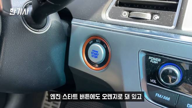 그리고 내장재 스티치들도 주황색 느낌으로 돼 있잖아요. 엔진 스타트 버튼에도 오렌지로 포인트가 적용돼 있고요. 그리고 기어봉에도 황동 색깔 느낌으로 마감이 되어 있는데 이것도 스티어링 휠이랑 같이 1.6 터보에서 가져온 거예요. 원래 색깔은 다 주황색입니다. 이건 약간 갈색빛 나는 색깔이고요.