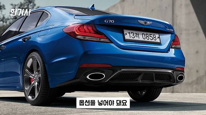 후면을 보시면 뒤에 스포일러가 붙어 있어요. 스포일러가 붙어 있는 모델이 터보 모델이랑 하이브리드 딱 두 종류밖에 없거든요. 비싼 차만 넣어주겠다는 거죠. 그리고 저는 후면부에서 가장 인상 깊은 게 듀얼 머플러예요. 이거는 말로 설명이 안 돼요. 지금도 저런 듀얼 트윈 머플러는 거의 안 해주는 걸로 알고 있거든요.