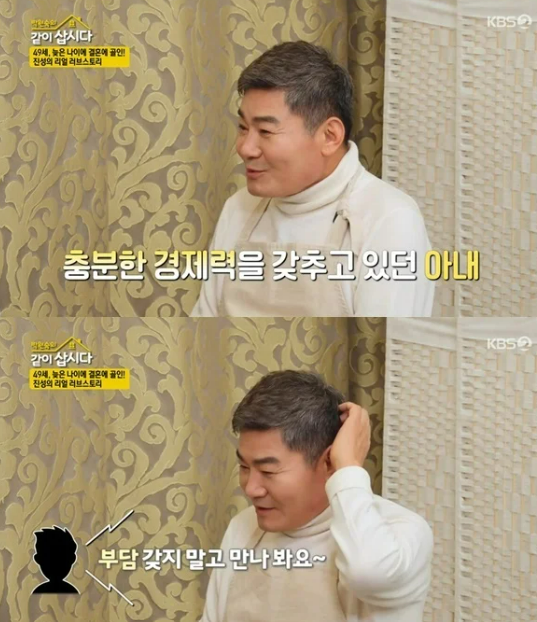 방송된 SBS '신발 벗고 돌싱포맨'에서는 트로트 가수 진성은 동갑내기 재력가 아내와의 러브스토리를 공개했습니다. 진성은 "처음에 커피숍에서 만났는데 가방을 큰걸 갖고 왔다. 그래서 오늘 일수 걷고 왔나 싶었다"라고 말해 웃음을 자아냈습니다. 이어 진성은 "내가 50대 초반에 이 사람을 만나서 건사할 수 있을까 싶었다"라고 말했습니다.