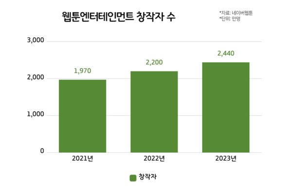 웹툰엔터테인먼트의 전체 창작자 수는 최근 3년 동안 매년 100만명 씩 많아졌다. 지난해 말 창작자 수는 약 2440만명이다. 미국에서 설립된 웹툰엔터테인먼트는 네이버의 웹툰 사업을 총괄하는 회사다. 한국의 네이버웹툰, 일본 라인망가, 북미 왓패드를 지배하고 있다.