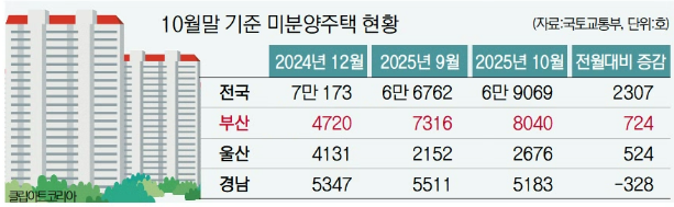 10월 말 기준 부산의 미분양 주택이 8000호를 넘어섰다. 이는 2010년 1월 8279호 이후 15년 10개월 만의 최대치다.