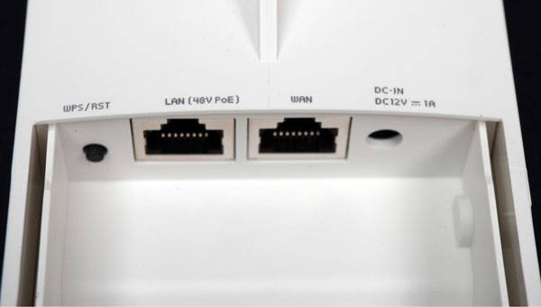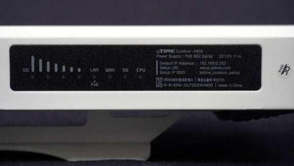 후면 하단에 위치한 커버를 열면 WPS/RST 버튼과 RJ-45 기가비트 LAN (48V PoE) 포트와 WAN 포트가 드러난다. ipTIME Outdoor-A900의 최대 소비 전력은 6W로 일반 12V DC 전원 어댑터(별매)를 통해서도 전원을 공급받을 수 있지만, IEEE 802.3at/af의 PoE 표준을 지원하여 PoE 스위칭 허브나 PoE 인젝터와 같은 장비를 통해 UTP 케이블로도 전원과 이더넷 신호를 동시에 전송할 수 있다.