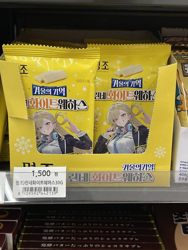 GS25 명조 콜라보 간식 라인업 중 하나로, 화이트 크림이 들어간 웨하스 4조각 구성의 미니 과자예요.