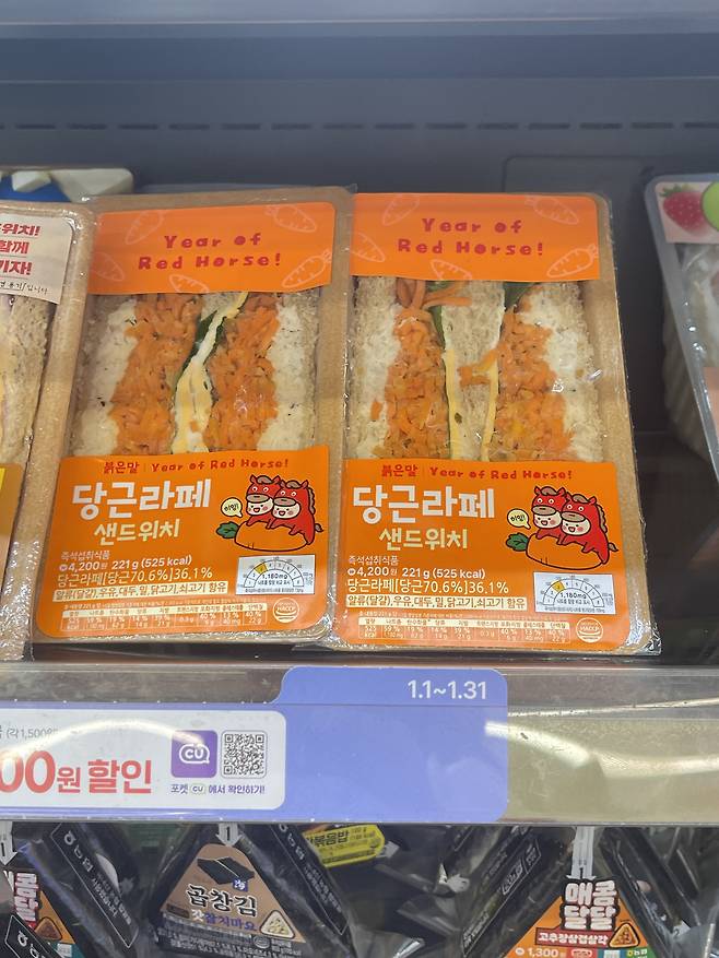 2026년 ‘붉은 말의 해’ 기념 CU 한정 간편식 시리즈의 하나로, 당근라페와 담백한 닭가슴살이 들어간 샌드위치 메뉴예요.