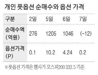 7일 한국거래소에 따르면 개인은 풋옵션을 지난 5일 1205억원, 6일 1046억원 순매수해 양일간 2251억원어치 사들였다. 5일 코스피가 8%대 하락하며 증시 변동성이 극심해져 풋옵션 가격도 2일 0.1P에서 10.2P로 100배 증가했기 때문이다.