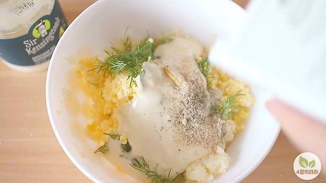 으깬 감자 + 달걀 + 딜 + 마요네즈 + 연겨자 + 소금 + 후추를 모두 넣고 잘 섞는다.