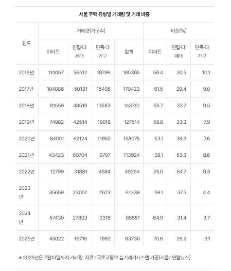 14일 국토교통부 실거래가시스템에 공개된 서울 주택 거래 신고 자료를 분석한 결과 올해 1월부터 7월 13일까지 매매 신고된 6만3천730건 가운데 아파트가 4만5천22건으로 전체의 70.6%를 차지했다.