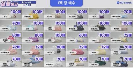 또한 제품별로 크기, 두께, 매수가 다르기 때문에 1팩에 포함된 전체 원단 무게를 기준으로 가성비를 판단하는 게 합리적인데요.