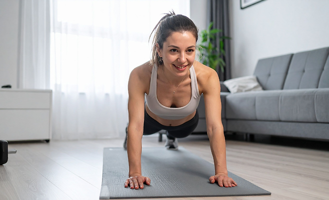 플랭크는 코어를 공략한다. 팔꿈치 대고 몸을 일직선으로 20초 버티며 시작해 1분까지 늘린다. 배·등·엉덩이가 동시에 활성화돼 균형이 잡힌다. 고관절이 처지지 않게 코어를 조이는 느낌을 유지하면 효과가 극대화된다.