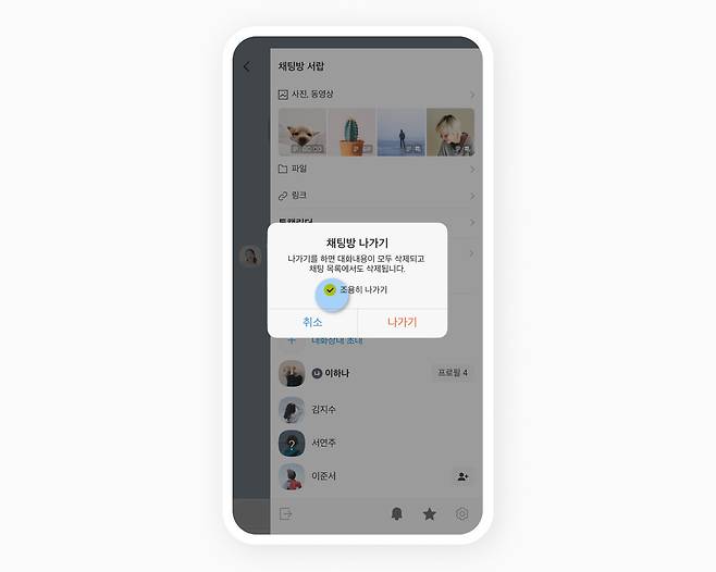 μΉ΄μΉ΄μ€ν‘μ 'μ±ν λ°© μ‘°μ©ν λκ°κΈ°' κΈ°λ₯μ κ·Έλ£Ή μ±ν λ°©μ λκ° λ 'OOOλμ΄ λκ°μ΅λλ€'λΌλ λ¬Έκ΅¬κ° λ€λ₯Έ μ°Έμ¬μλ€μκ² νμλμ§ μλ κΈ°λ₯μ λλ€.