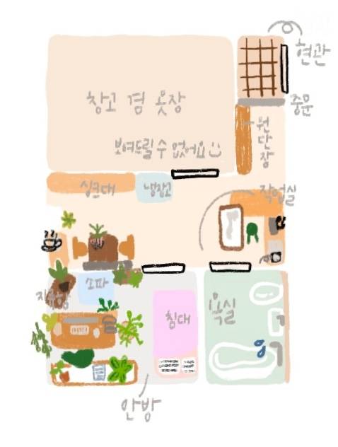 저희 집 도면이에요. 이번 집은 베란다가 없어서 아쉽지만 오래된 집 치고는 구조가 무난하죠? 어마어마한 당근 거래량과 나눔에도 5톤 트럭 3대에 싣고 올 정도로 짐이 많아서 작은 방을 안방으로, 큰 방을 옷장 겸 창고로 써요.