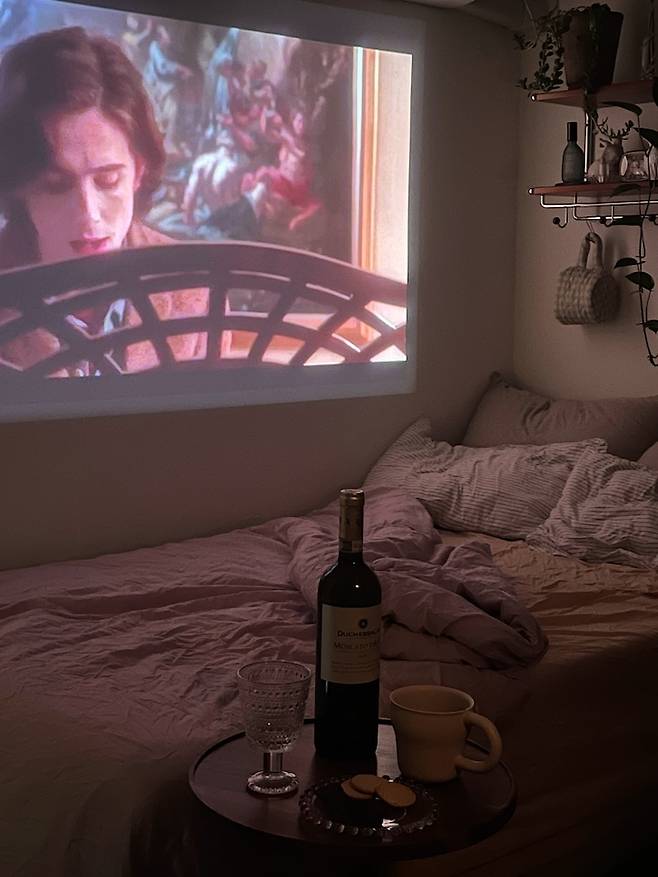 소파에서 반 쯤 누운 자세로 앉아 간단히 먹을 것들을 협탁에 두고 영화를 보는데 책상에 빔을 두는 각도마저 딱 맞아요. 미니빔은 각도를 맞추느라 바닥에 뭘 대고 조절하고 하다 보면 정말 피곤해지거든요. 그렇게 되면 자연스레 손이 덜 가게 되는데 그런 불편함이 없으니 전보다 빔을 자주 사용하게 되는 것 같아요.