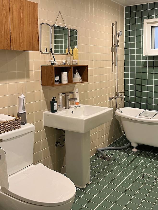 크림색과 민트그린 색상의 타일을 골랐고 거울이랑 선반은 따로 오늘의집에서 구매했구요, 거울이 저는 너무 맘에 들지만 저보다 키가 크거나 작으면 잘 안 보일 수 있어요^^;; 맞춤 거울이랄까요..ㅎㅎ