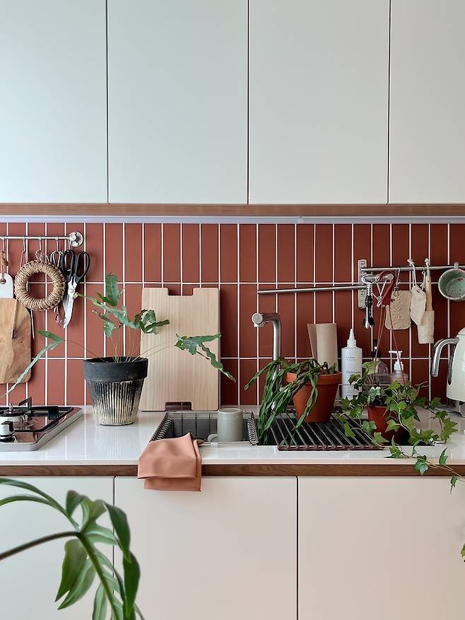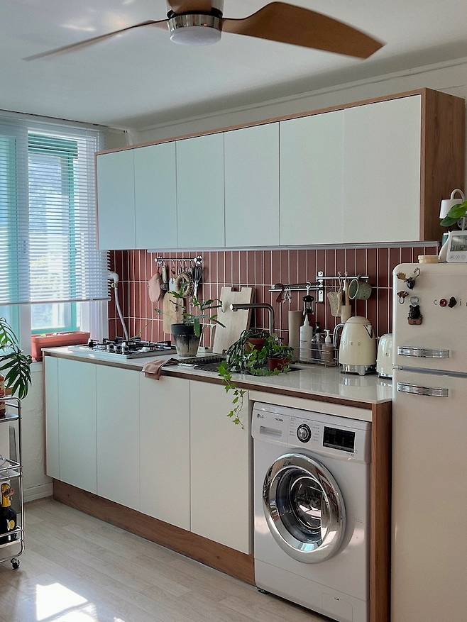 굉장히 깔끔해졌죠! 이 집은 화장실이 제법 넓어서 욕조를 꼭 두고 싶었기 때문에 세탁기를 빌트인으로 넣었어요- 싱크대는 ' 버터 스튜디오'에서 주문 제작했고요. 문과 인조 대리석, 엣지의 색상을 고르고 타일은 주방에 일반적으로 사용하지 않는 테라코타를 골랐어요. 테라코타의 색감이 나머지 색감과 너무 잘 어울릴 것 같더라고요.