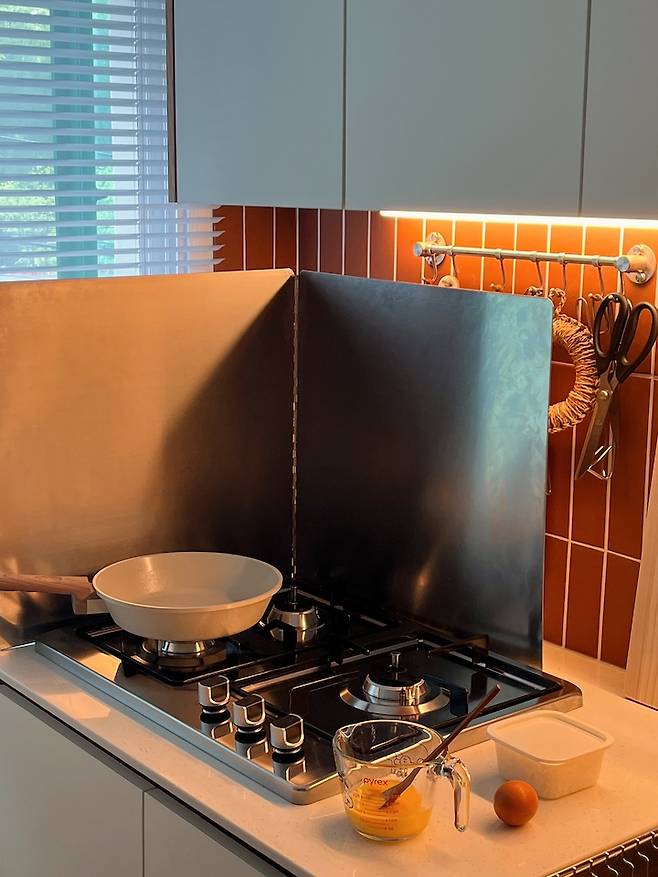 공사하시는 분들이 이렇게 하는 건 처음이라고 하셨는데 저도 참 이상한 고집이 있어서 만류가 있었음에도 밀어붙였고 지금은 요리할 때만 이렇게 레인지 가드를 세웠다 접었다 해요. 이 정도의 수고스러움은 예쁨으로 커버하고 있습니다ㅎ (테라코타는 코팅이 되어 있지 않기 때문에 음식물이 튀거나 하면 얼룩이 스며 들어서 그대로 남을 수 있어요..^^;; )