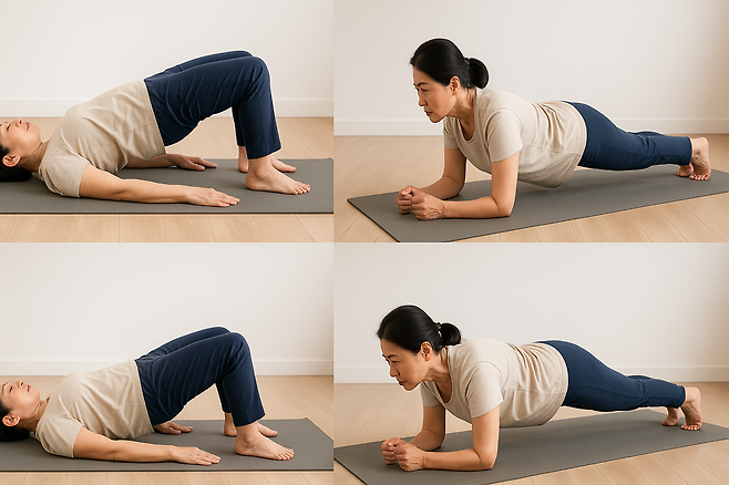 • 시간: 15~30초×3세트(무릎 플랭크부터 시작).