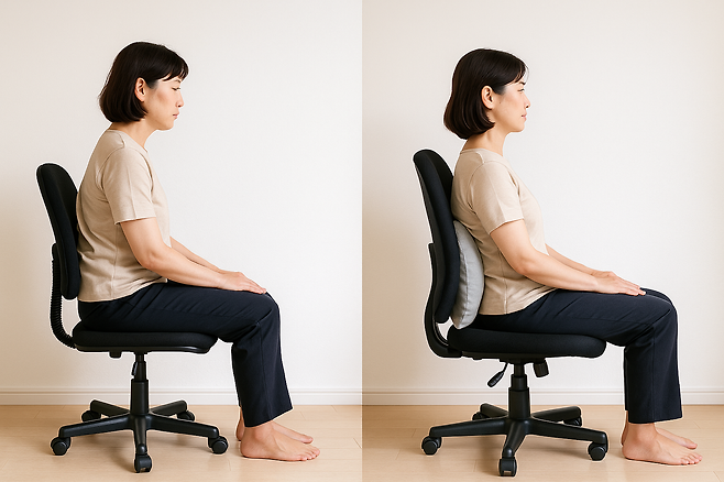 “엉덩이 끝 대신 등받이, 다리 꼬기 대신 발판, 바닥 대신 의자—이 세 가지만 바꿔도 허리는 한결 편해집니다.”