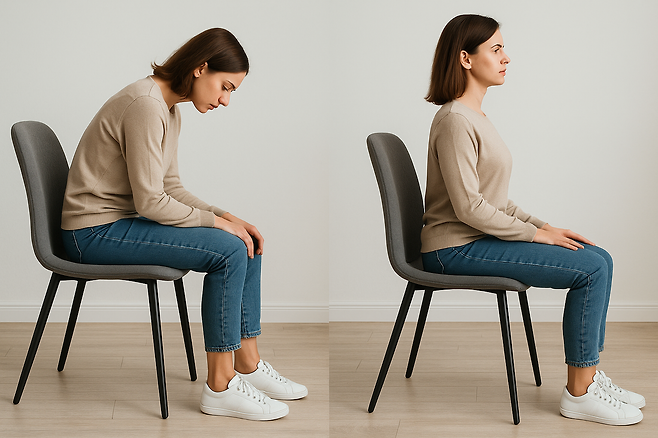 📌 한 줄 체크: 엉덩이-허리-머리 세 점이 등받이에 닿는 느낌 + 발은 바닥 고정.