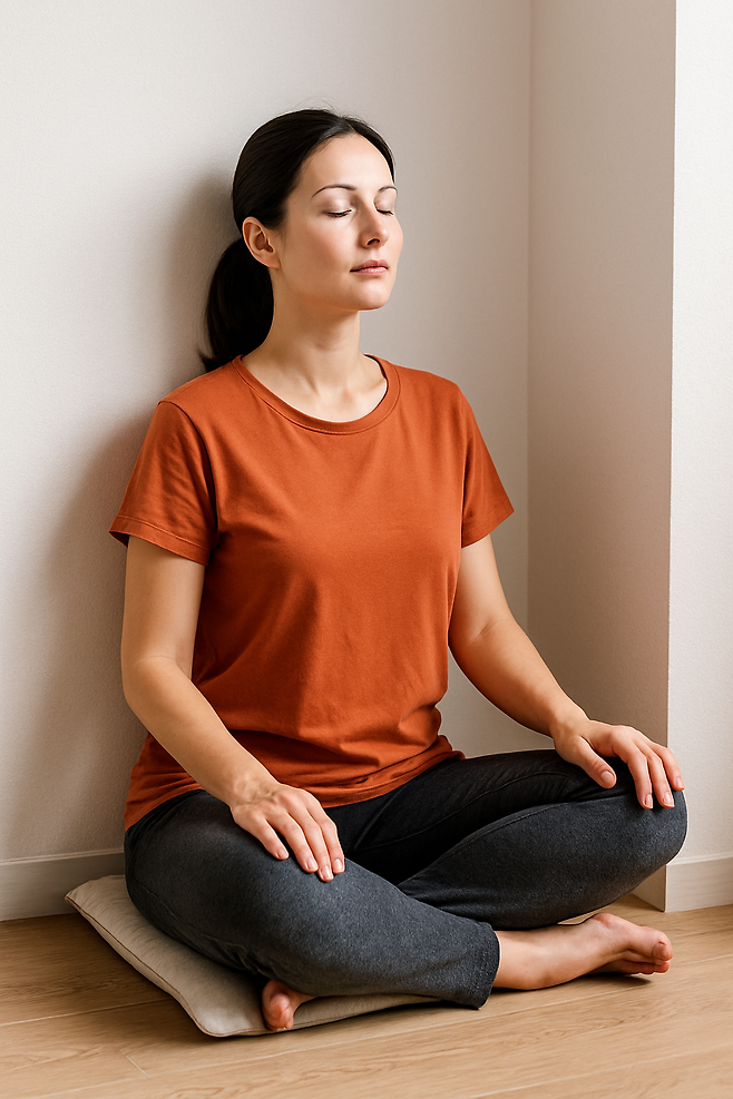 • 등받이 : 허리 뒤에 작은 쿠션/롤타월로 요추 지지. 깊숙이 앉아 골반 중립 유지.