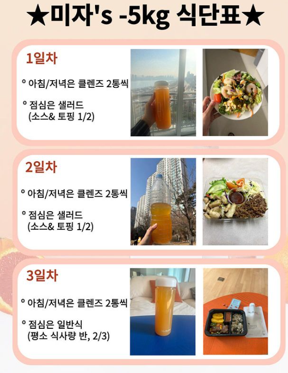미자는 아침식사와 저녁식사는 클렌즈 주스로 대신하고 점심은 샐러드나 일반식을 했다고 밝혔다.