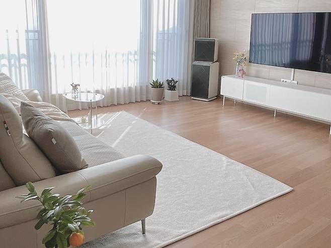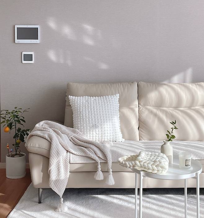거실에는 너무 많은 소품과 가구로 진열되면 답답한 느낌이 들 것 같아서, 가구와 인테리어 소품은 실제로 자주 사용할 제품들만 구매하려고 했어요. 물론 색상은 화이트와 베이지 느낌으로 최대한 통일하려고 했구요:) 저 담요는 너무 부드러워서 티비볼 때 애착 담요처럼 꼭 덮고 보고 있어요ㅎㅎ
