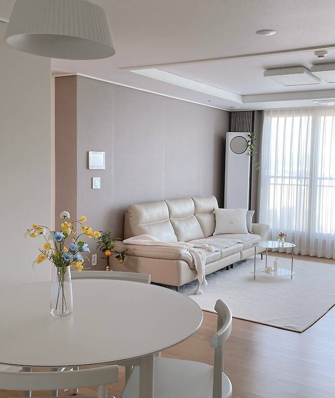 하지만 거실 부분만 집안에서 가장 색감이 있는 연회색으로 도배가 되어 있었고, 기본 아트월도 베이지 색상이었어요. 도배와 아트월도 더 밝은 색으로 시공하고 싶었으나, 가구 인테리어와 소품들로만 밝은 느낌을 주기로 선택했어요!