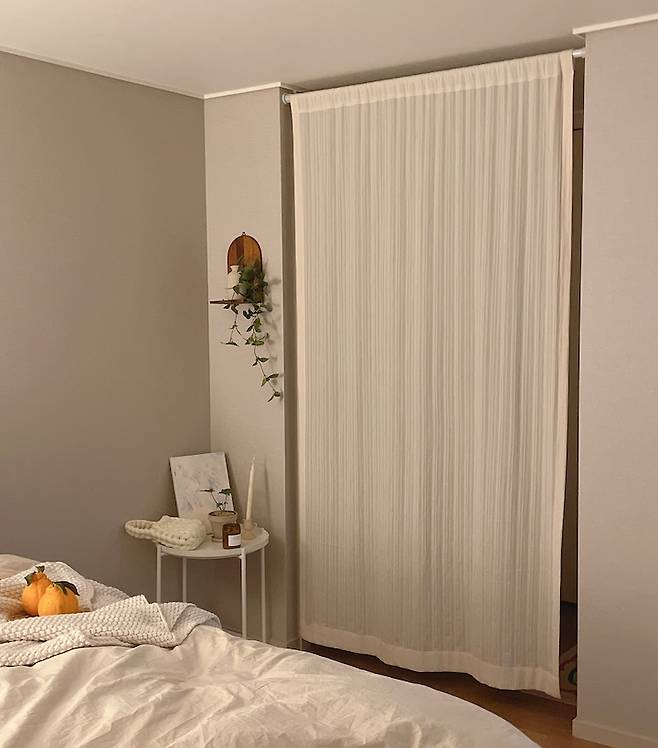 안방 침대에서는 드레스룸과 화장실로 가는 공간이 보이는데, 이 부분을 가리고 싶어 압축 봉과 가리개 커튼을 이용해 가려보았어요. 방 내부에 있는 커튼이라 너무 무거움을 느끼지 않는 가벼운 재질의 커튼으로 구매했는데 하늘거리고 은은하게 불도 비춰 너무 만족스러운 모습이에요!
