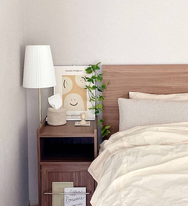 낮에 자연광에서 찍은 모습은 이런 느낌이에요:) 침대 옆 협탁은 안에 수납할 수 있는 공간이 있어 간단한 서류나 각티슈 등을 넣어두었어요.