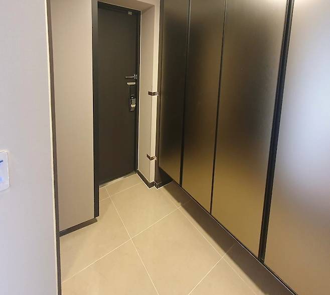 이사 오기 전 현관은, 검정색 현관문과 메탈 소재의 신발장으로 어둡고 차가운 느낌이었어요. 하지만 집 안에 가장 처음 마주하는 공간 치고 다소 너무 어둡다는 생각에 시트지 시공을 진행하기로 결정했어요.