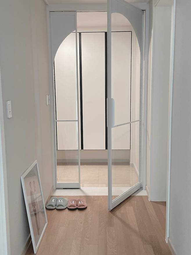 중문이 설치되는 디딤돌 부분에도 대리석 모양의 시트지 시공을 했고, 그 위에 화이트 여닫이 중문을 설치했어요. 저희 집은슬라이딩 도어를 설치할 수 없는 구조였기에, 180도로 열리는 아치형 중문을 시공했고, 아치형 디자인으로 집안이 조금 더 아늑한 느낌이 드는 것 같아요:)