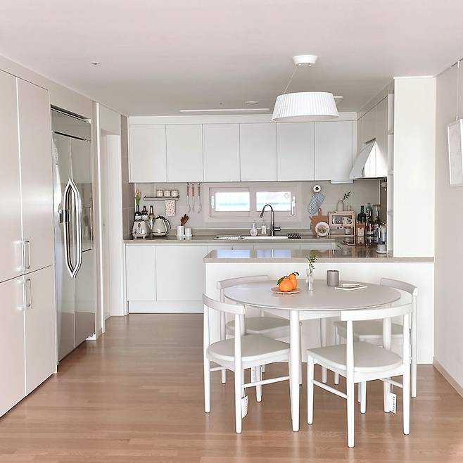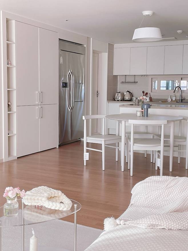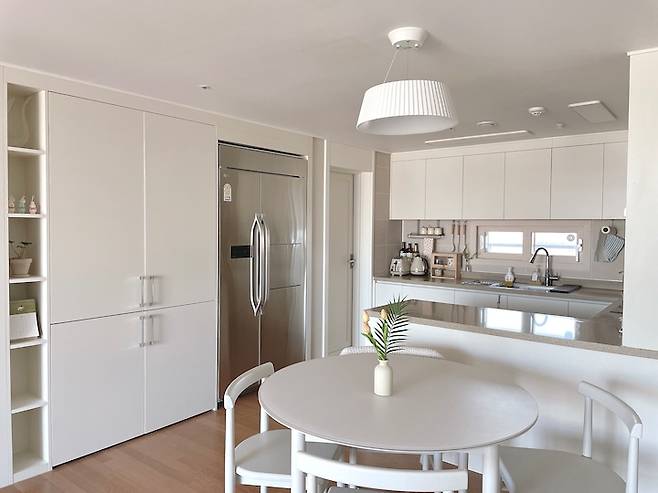 거실에서 보이는 주방의 모습은 대략 이런 느낌인데요~. 화이트 수납장과도 빌트인 냉장고로 주방이 깔끔하게 보이도록 했고, 식탁도 화이트로 통일했어요.