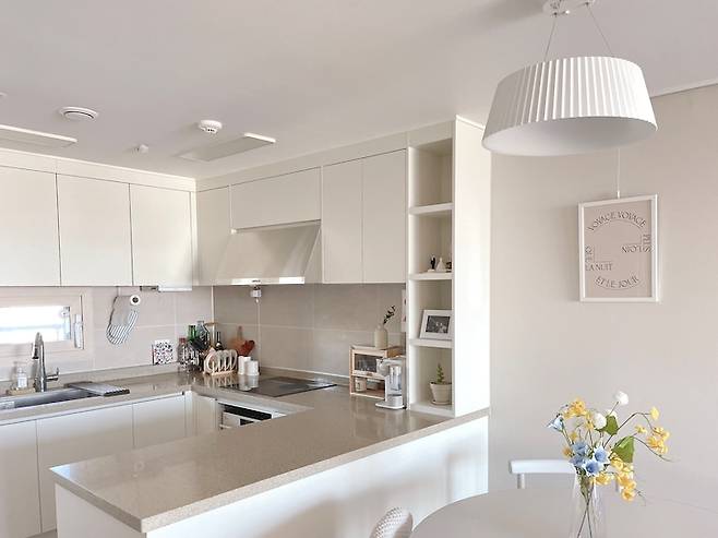 주방도 화이트로 깔끔한 느낌을 주고 싶어, 싱크대 하부장과 선반장 모두 시트지 시공을 진행했어요. 화이트 색상으로 시트지 시공을 하고, 식탁도 화이트 색감으로 통일하니 너무 깔끔하고 제일 좋아하는 공간이 되었어요.