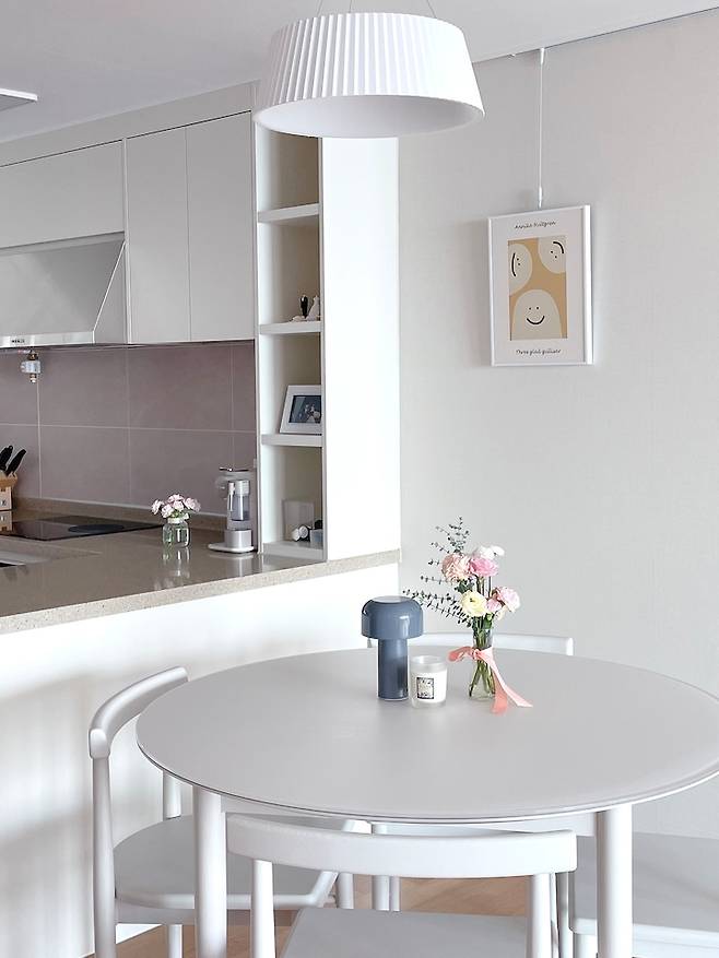 이사 오면서 식탁은 6인용 식탁을 놓고 싶었으나, 식탁 공간이 넓지 않아 원형 테이블로 식탁을 선택했는데 너무 만족한 선택이었어요! 의자 등받이도 식탁 높이보다 높지 않아 주방 시야를 가리지 않고, 원형으로 공간 활용을 하기에도 너무 좋더라구요. 또한 화이트 원목 식탁으로 튼튼하고 오래도록 사용할 수 있을 것 같아요:)