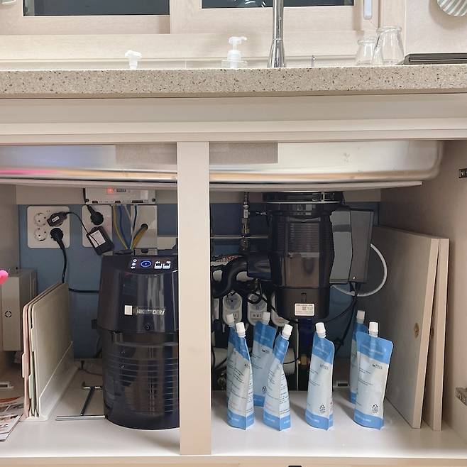 싱크대 아래 음식물을 분쇄하고 걸러주는 기기가 들어가는데, 사이즈가 조금 있어 싱크대 아래 한쪽 면에 두어야 하니 이점 참고해주셔야 하세용:) 그리고 음식물 처리기는 이사갈 때도 뜯어서 가져 갈 수 있어 더 더 좋은 것 같아요!