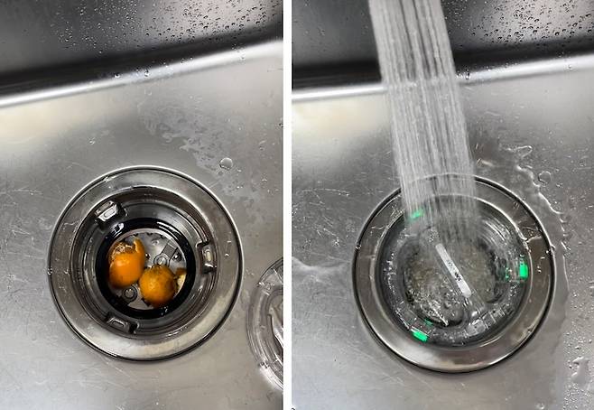제가 설치한 음식물 처리기는 '싱크리더'라는 브랜드인데, 싱크대에 음식물을 넣어주고 뚜껑을 닫아주면 이렇게 초록색 불이 들어오게 되어요! 그럼 물을 틀어 음식물이 잘 갈려 질 수 있도록 하고, 뚜껑을 돌리면 음식물이 감쪽같이 갈아 없어지게 돼요.