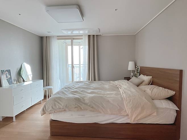 아침에 전체적으로 안방을 찍은 모습이에요. 안방은 잠을 편하게 자야하는 공간이라 너무 많은 소품과 가구들 배치하기 보다는, 아늑하고 깨끗한 느낌으로 스타일링을 해보았어요.