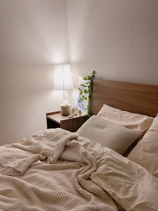 침실 벽면에는 침대 프레임과 비슷한 원목색의 협탁을 두어 아늑한 느낌으로 꾸며보았어요. 자기 전에 핸드폰과 휴지 등을 올려 둘 수도 있어 남편 옆에 협탁을 두었어요. 그리고 옆에는 전구색 스탠드 조명을 두어 자기 전에 따뜻한 분위기를 연출할 수도 있어요! 잠이 안 올 때 스탠드 조명을 켜두고 남편과 이야기 하고 잠이 들곤 하지요.