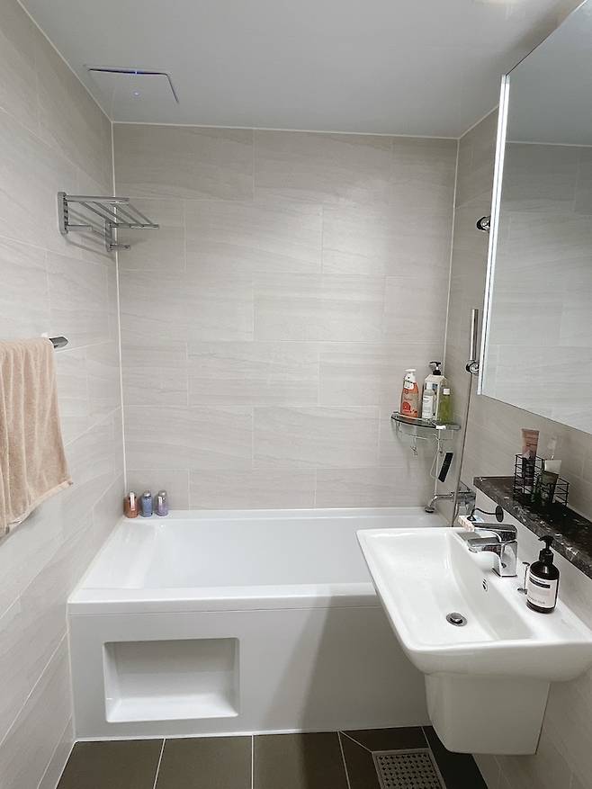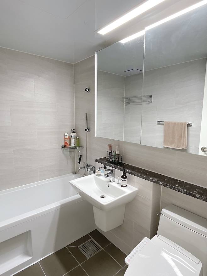 거실 욕실하고 안방 욕실은 비슷한 구조에 욕조의 유무만 차이가 있어요. 지금 공간은 거실 화장실인데, 욕조는 아이가 있으면 잘 사용하지 않을까 싶어요:)