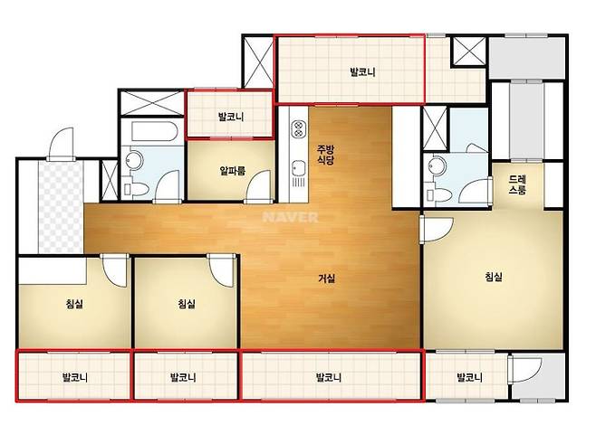 실제 거주 중인 집은 도면과 다르게 안방 발코니만 제외하고, 빨간 테두리로 표시한 나머지 침실 3곳과 거실, 주방 발코니는 확장되어 있는 상태로 집이 조금 더 넓어보이는 효과가 있으니 참고해주세요!