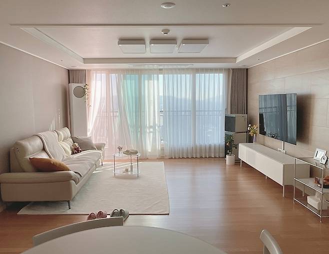 이사 오기 전 거실 모습이에요. 고층 뷰라 시야를 가리는 높은 건물들이 없고, 남동향으로 낮에는 햇살이 잘 들어와 기본적으로 조명을 켜두지 않아도 밝은 편이였어요.
