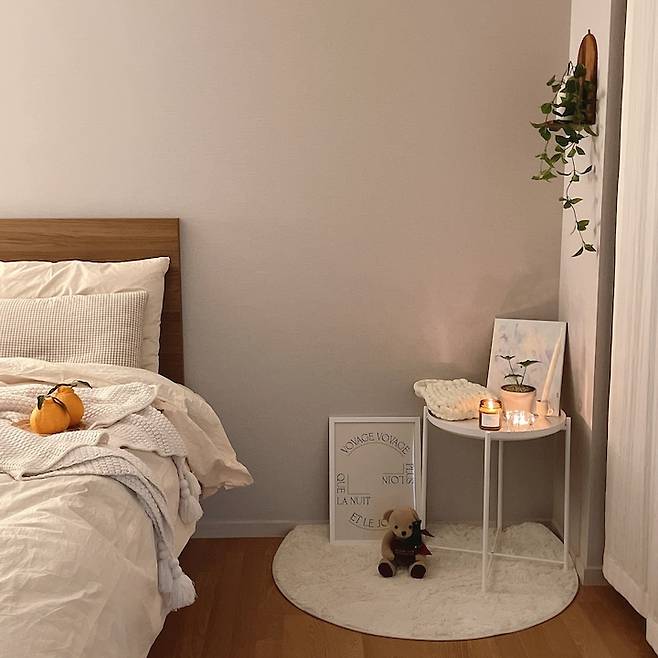 침실에서 드레스룸으로 들어가기 전 공간은, 자기 전에 간단하게 초나 소품을 올려둘 수 있는 공간으로 꾸며보았어요. 부드러운 원형 러그를 두고 작은 협탁을 두니 저만의 작은 힐링 공간이 된 것 같아요! 겨울에는 작은 크리스마스 트리를 두기도 하고, 여름에는 라탄 의자도 가져다 꾸며볼 계획이에요:)