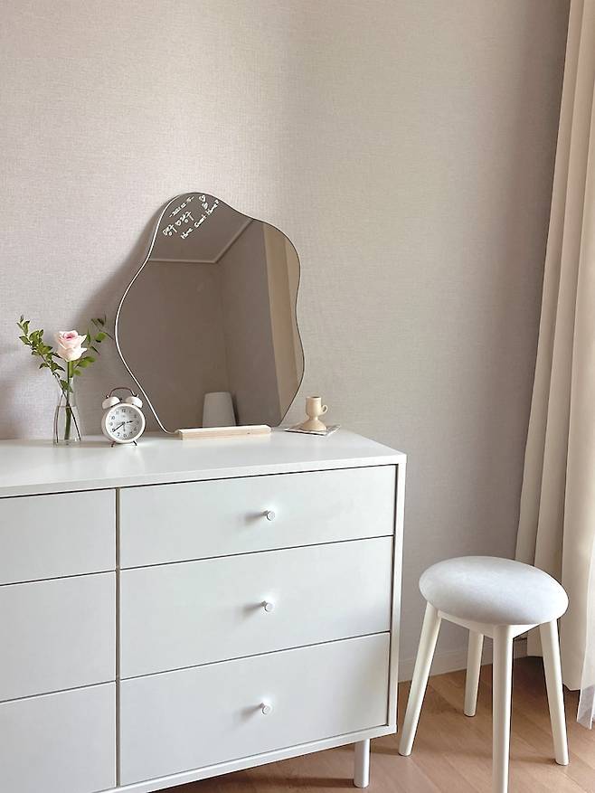 안방에는 다소 수납 공간이 부족해 침대 맞은편에는 화이트 수납장을 두었어요. 수납장에는 가장 많이 사용하는 간단한 잠옷과 양말 등을 넣어두었어요. 수납장은 원목색으로 할 지, 화이트색으로 할 지 오랜 시간 고민했는데, 침대도 원목색인데 수납장도 원목색으로 하면 조금은 어두운 느낌이 날까봐 화이트로 구매했는데 깨끗해 보이구 밝아보여서 좋은 것 같아요:)