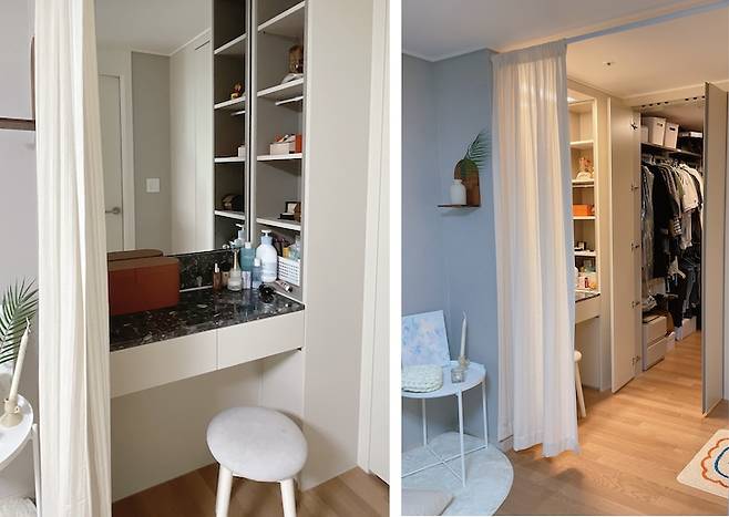 안방에서 가리개 커튼을 설치한 뒷 부분은 사진과 같이 화장대와 작은 드레스룸이 있는데, 이 부분은 커튼으로 가려지는 부분이라 따로 시트지나 시공을 하지 않았어요. 화장대 부분도 예쁘게 시공할까 고민했는데, 방 중에서도 안쪽 부분에 위치하고 있고 새 가구였기에 그냥 사용하기로 결정했어요. 대신 가림막으로 저렴하게 인테리어하니 너무 만족스러워요:)
