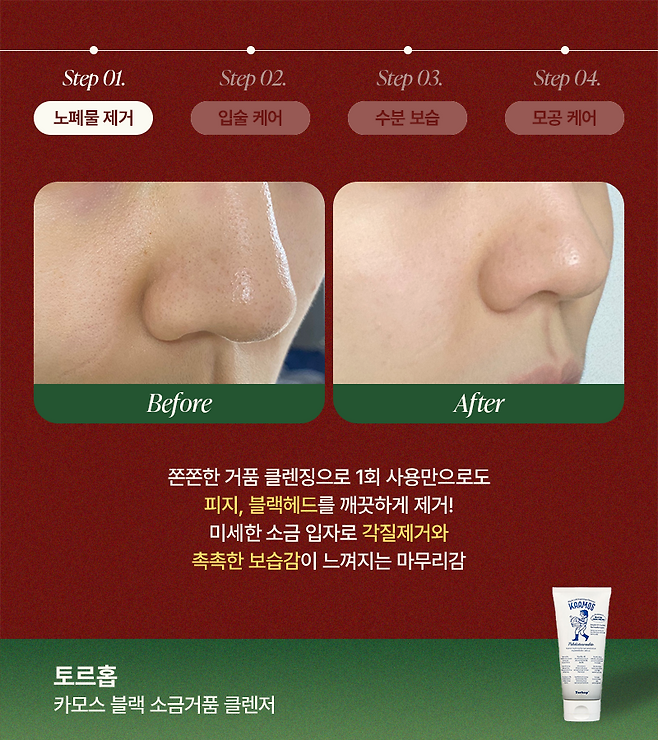 1회 사용만으로도 피지와 블랙헤드가 눈에 띄게 개선되었다. 미세한 소금 입자가 각질을 부드럽게 제거하면서도 피부를 자극하지 않았고 사용 후에도 촉촉한 보습감이 남아 건조하지 않았던 것이 겨울철 건조한 날씨에 사용하기 제격인 제품. 특히, 코 부위의 블랙헤드와 피부 톤이 깨끗하게 정돈된 것이 느껴져서 너무 좋았다.